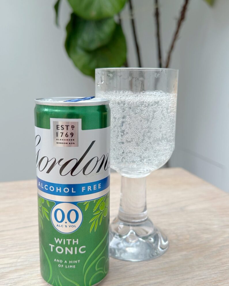 Gordon’s alcohol free gin and tonic is flavored with a “hint of lime.” Though in reality it’s natural flavors and citric acid. Sweetened with cane sugar, it’s 63 calories per can.